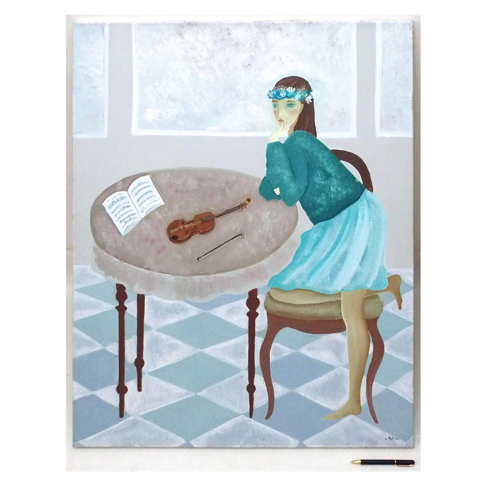 「少女とバイオリン」クレール・アステックスによるキャンバスに油彩30号、大型作品です。