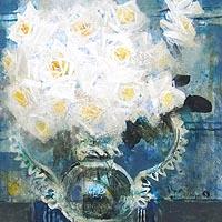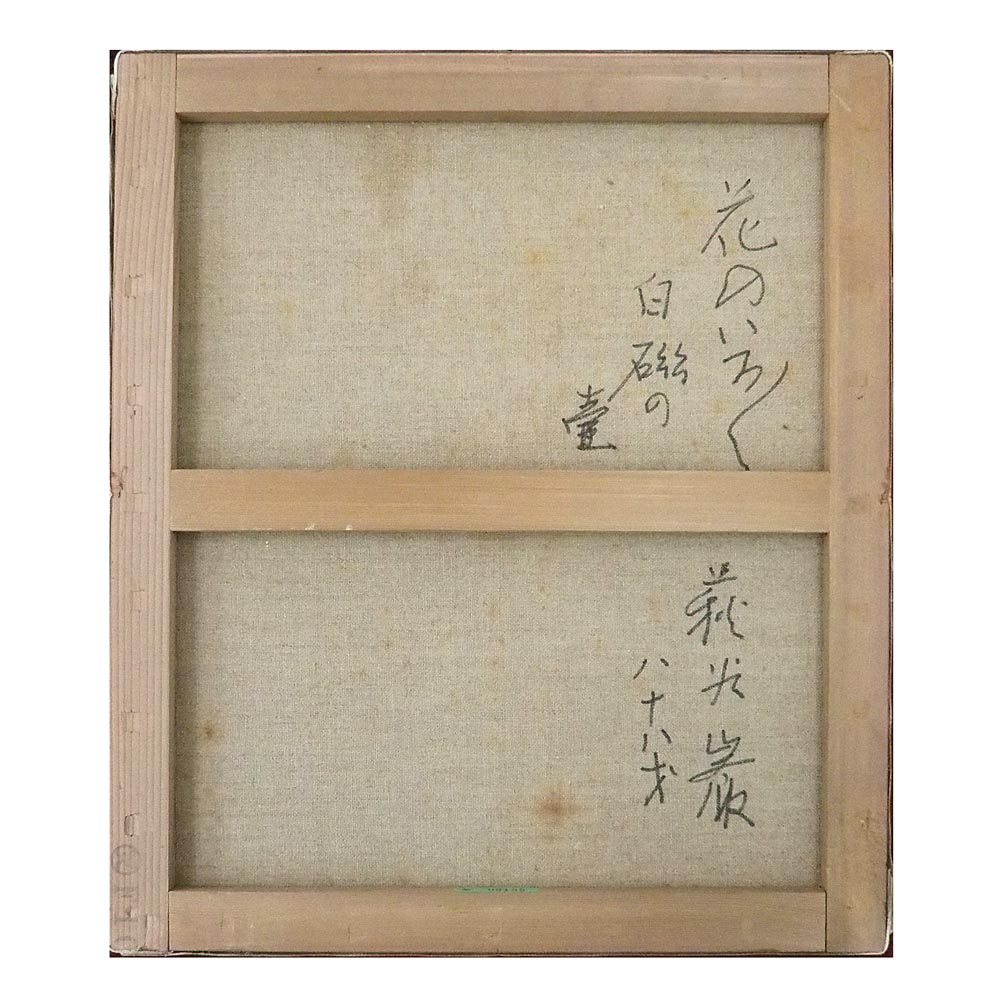 「花のいろいろ白磁の壺」萩谷巌によるキャンバスに油彩10号です。