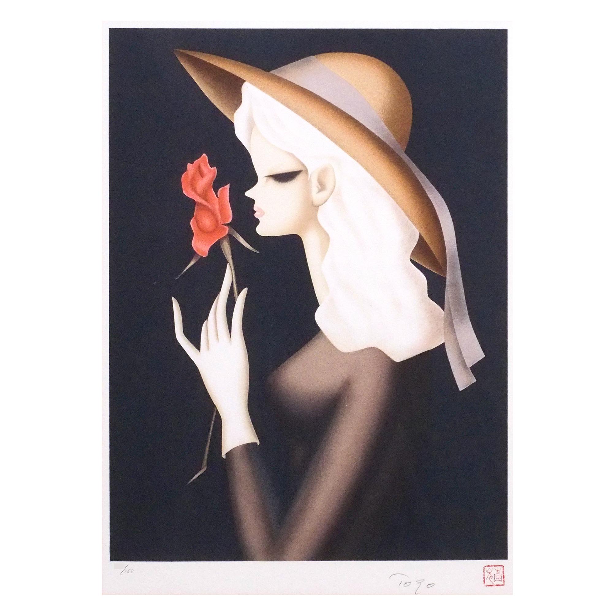 東郷青児による「バラ一輪」。東郷たまみのサインと印入りのリトグラフです。