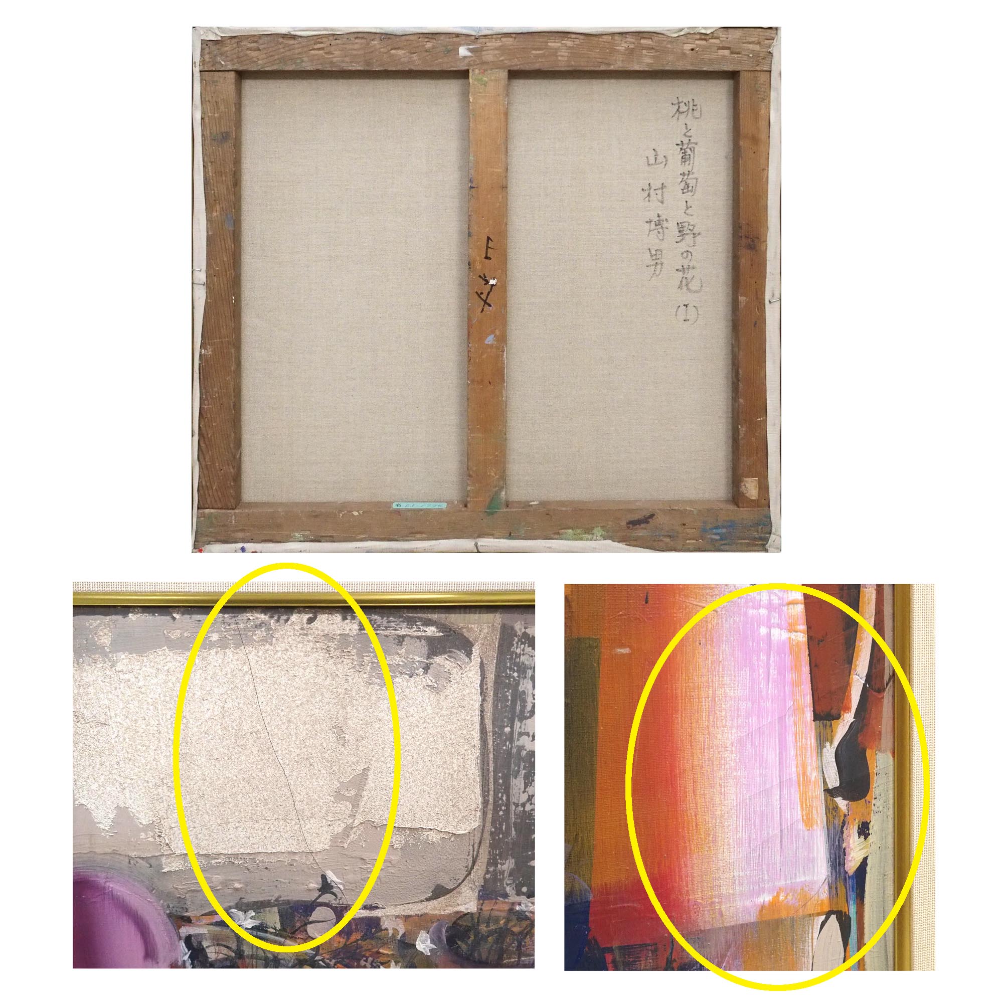 「桃と葡萄と野の花(I)」山村博男によるキャンバスに油彩10号で、額裏に日動画廊シールがございます。作品にワレがございます。