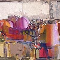 「柘榴と香水瓶のある静物」大沼映夫による1992年作のキャンバスに油彩6号です。