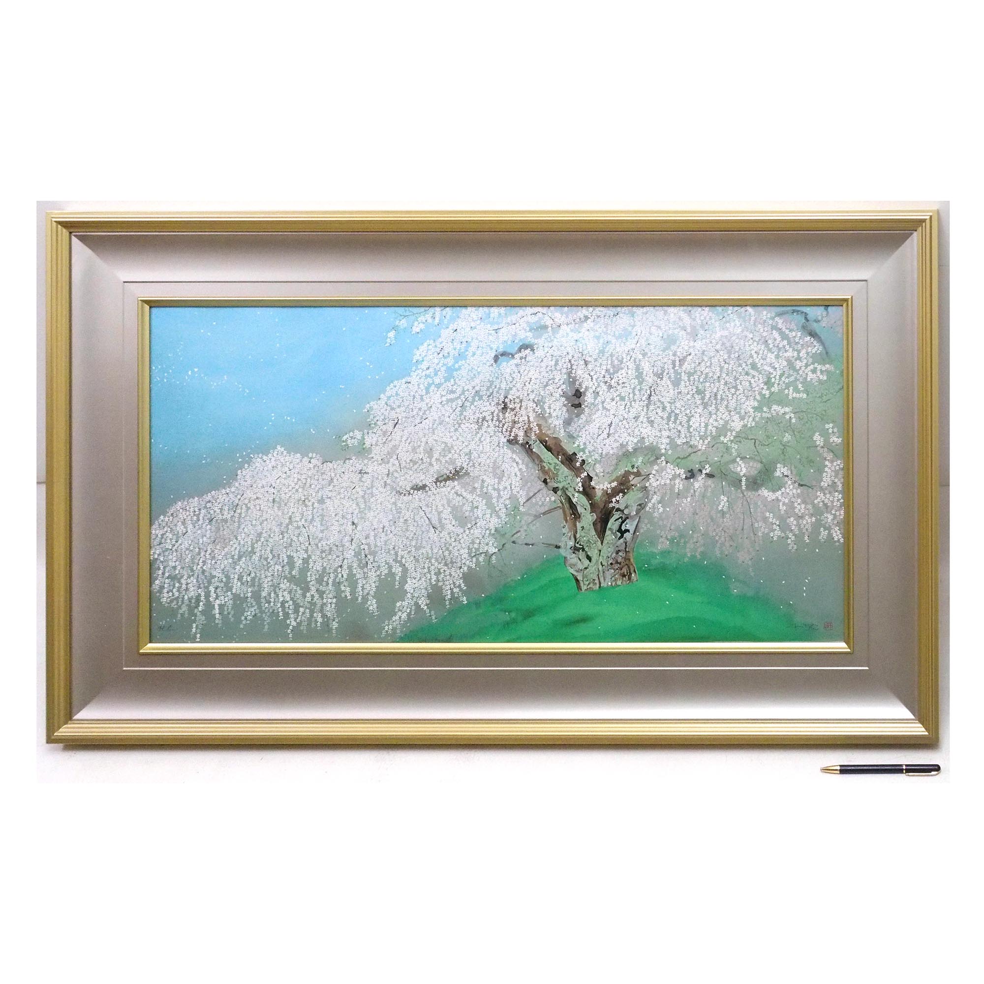 「晴日 本久寺の枝垂桜」中島千波による2001年作、直筆サイン・印有りのシルクスクリーンです。大きいサイズですが、横長のため空間に収まりがよい作品です。