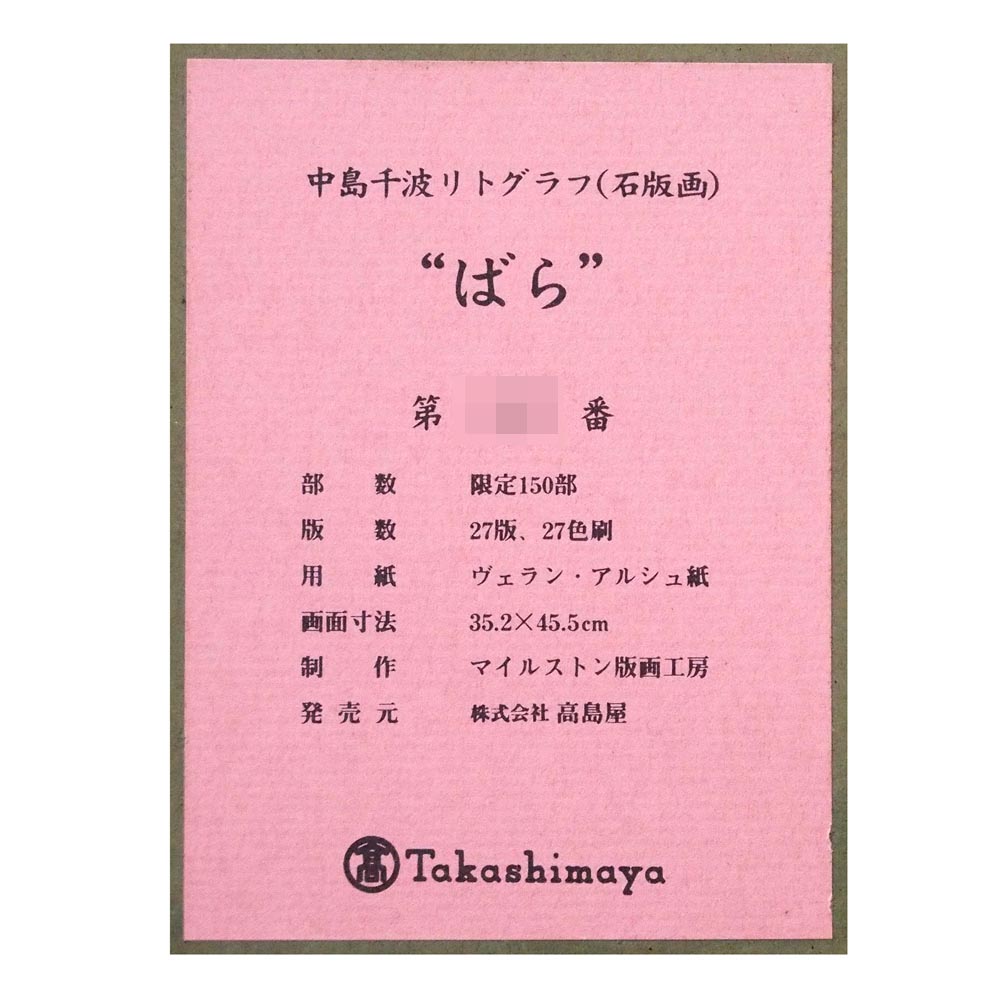 「ばら」中島千波による直筆サイン・印有りのリトグラフです。