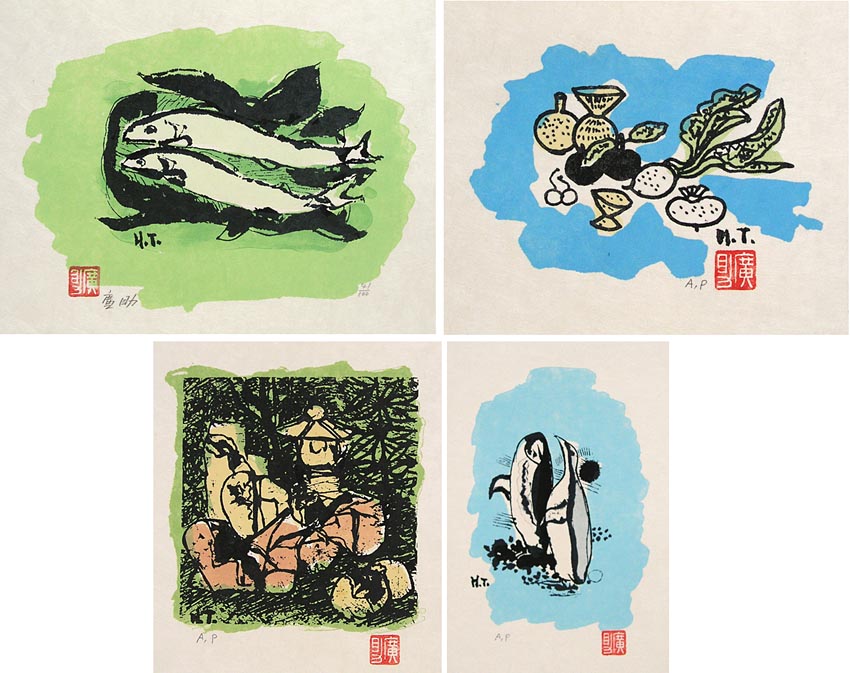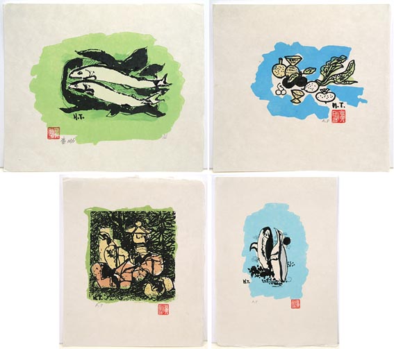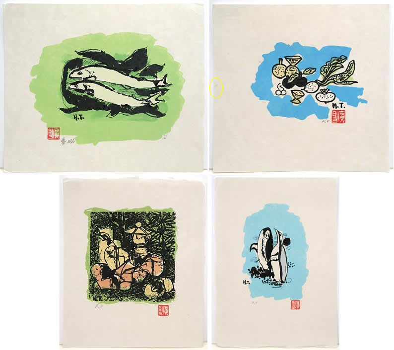 田崎広助による版上サインと印有り、和紙摺りのシルクスクリーンです。魚、根菜などを描いたシート4点セットで、限定100部、EAなどの記載があります。シートにシミはございますが、鑑賞に差支えない程度で、落札後、ご希望により無料にて額装のお見積りも承ります。1898年福岡県生まれ。1975年文化勲章受章。風景画、特に日本の山が多く、その中でも阿蘇山を題材にしたものを多く描いています。1984年、85年の生涯を閉じました。