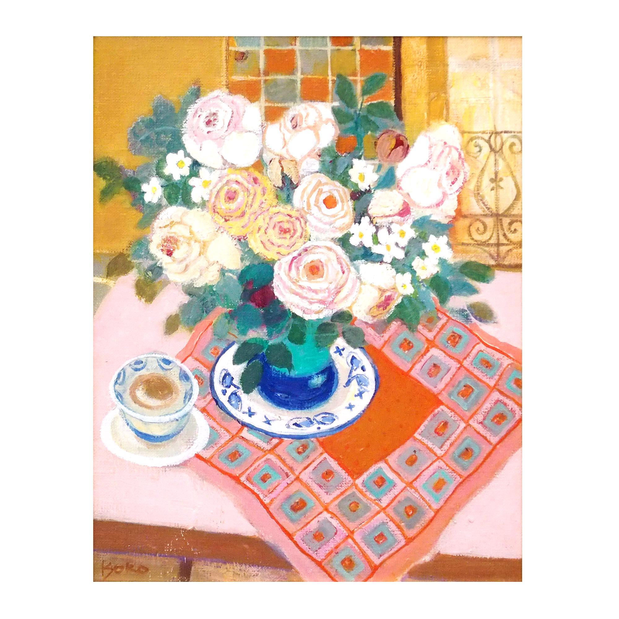 「オレンジのテーブル」山下京子によるキャンバスに油彩3号、飾りやすいサイズの作品です。