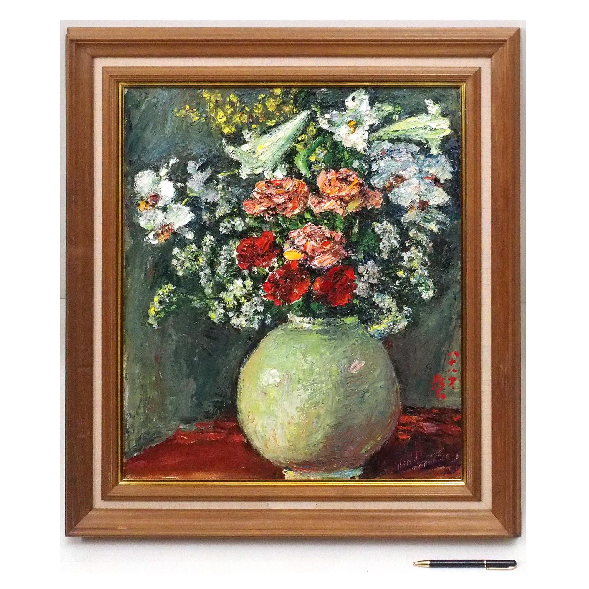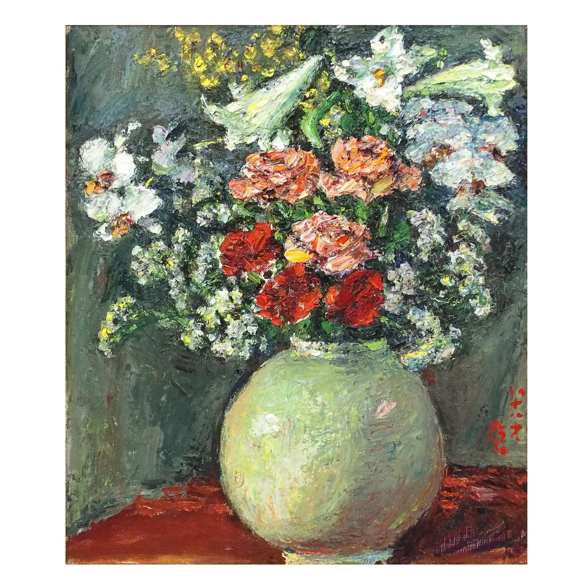 「花のいろいろ白磁の壺」萩谷巌によるキャンバスに油彩10号です。