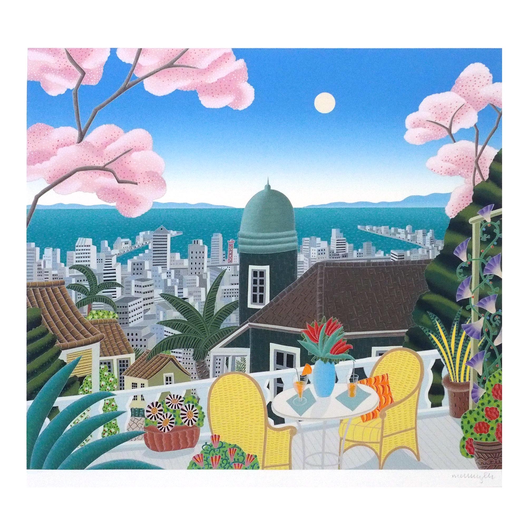 世界各国のリゾート地を描いており、出品作品は、1993年に発表された「KOBE」シリーズとなります。異国情緒漂う北野の街に桜の木が美しい作品です。