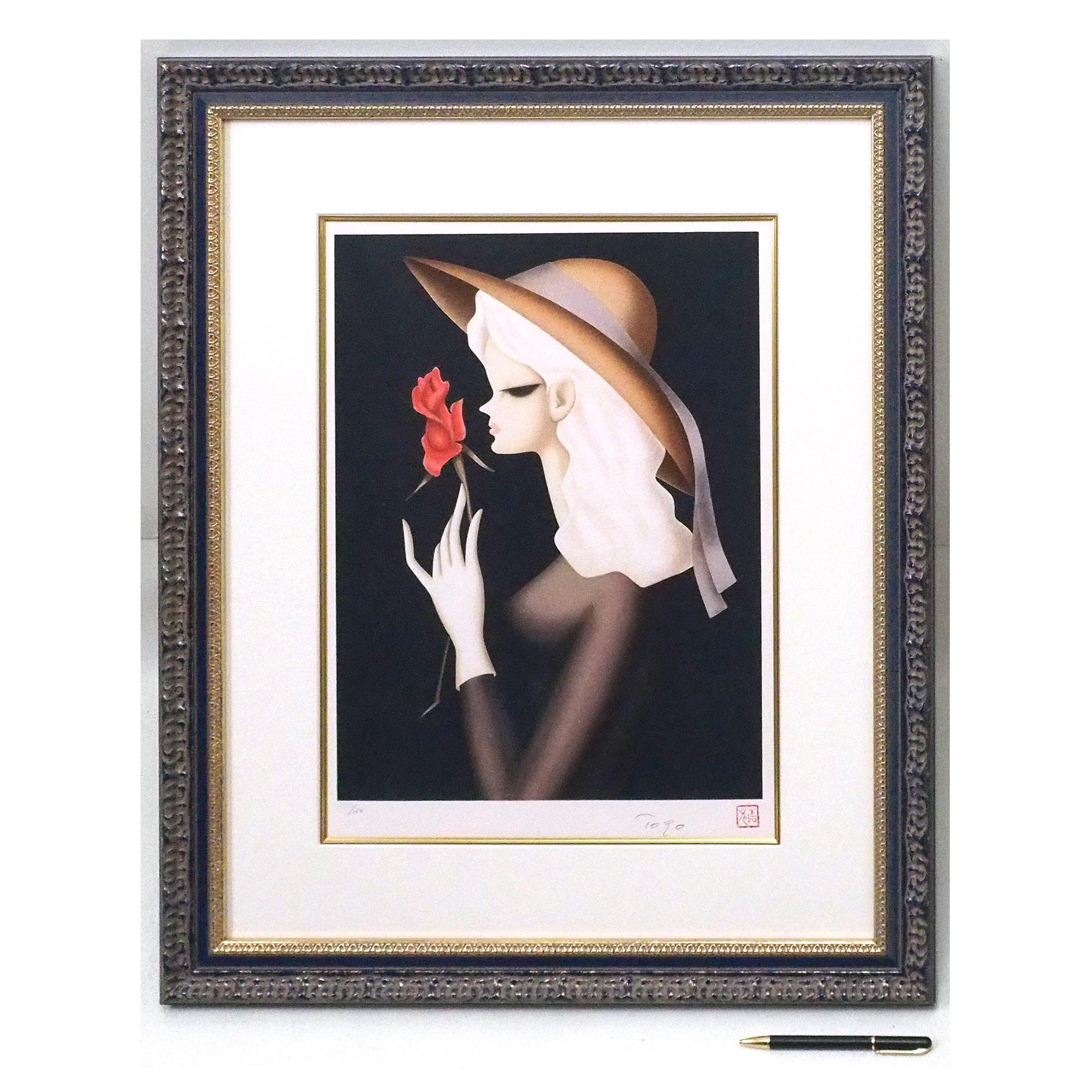 東郷青児による「バラ一輪」。東郷たまみのサインと印入りのリトグラフです。