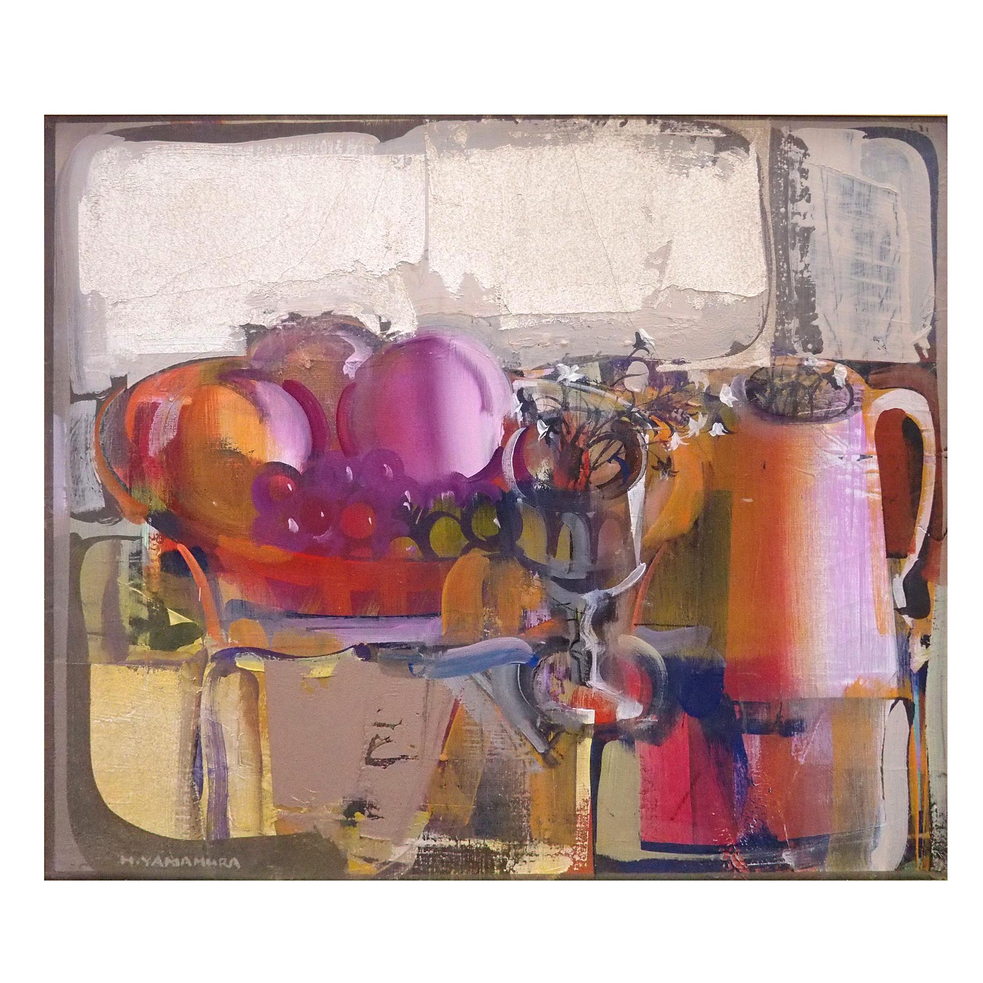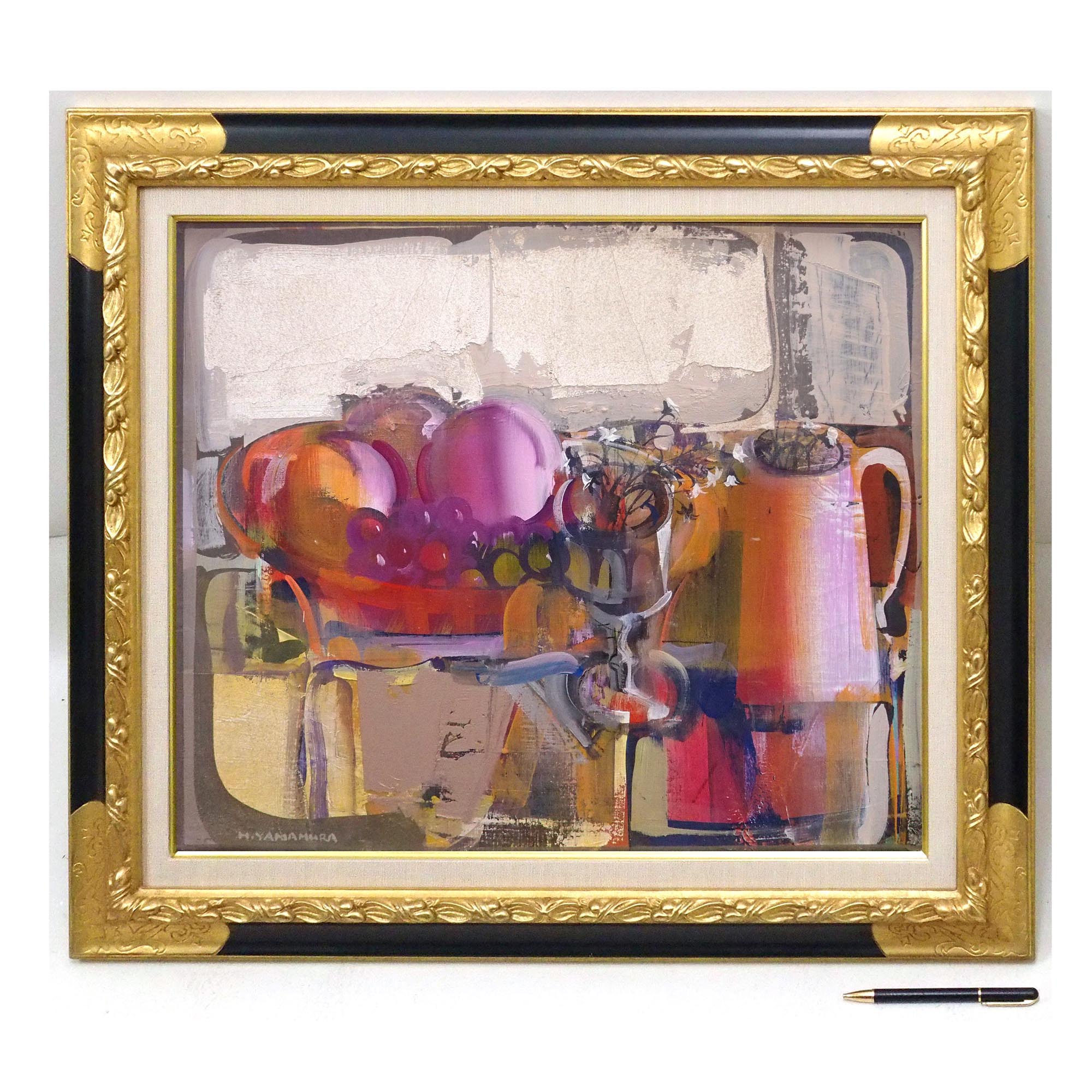 「桃と葡萄と野の花(I)」山村博男によるキャンバスに油彩10号で、額裏に日動画廊シールがございます。作品にワレがございます。