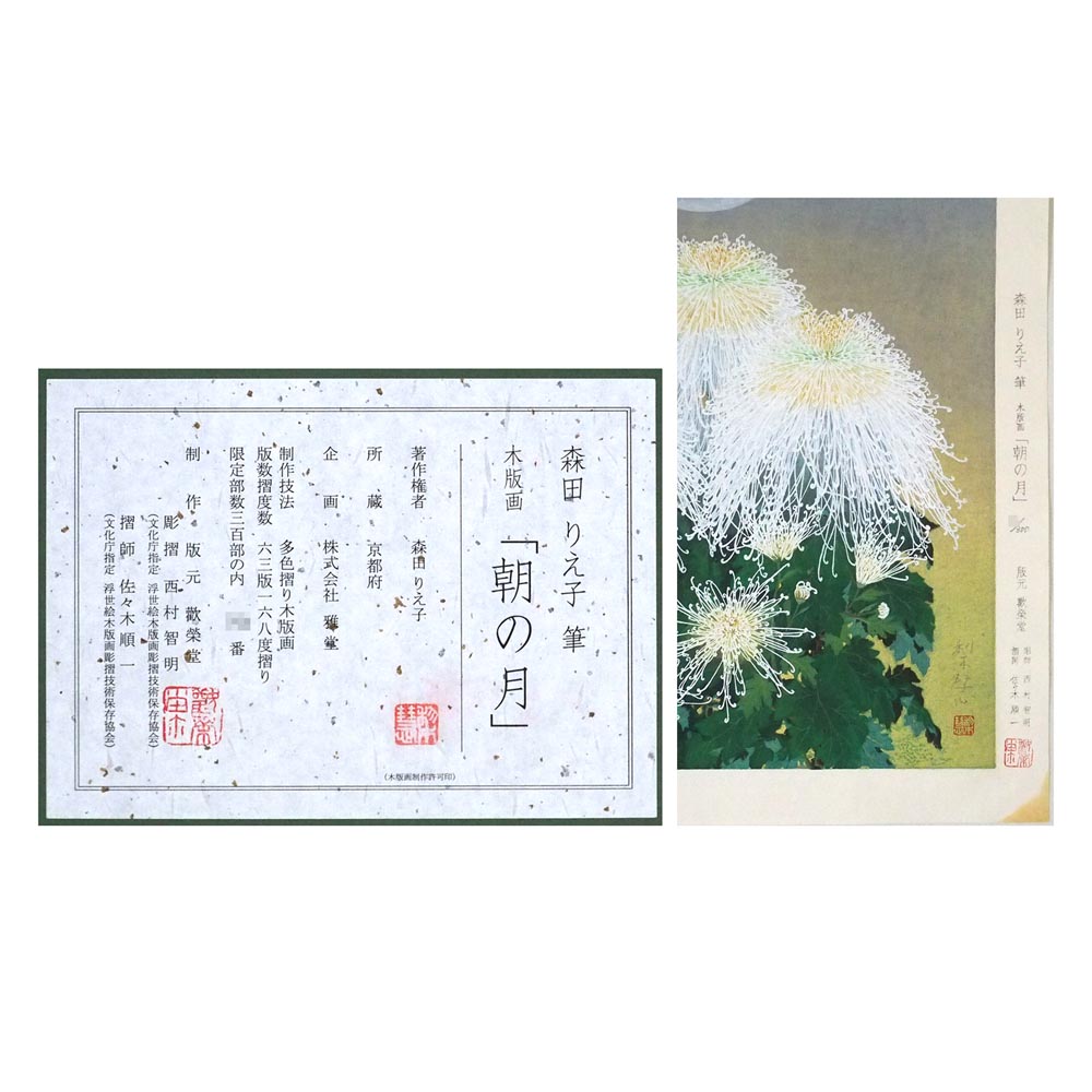 森田りえ子による「朝の月」。歡榮堂制作の作家直筆サイン・印有りの多色摺り木版画です。額裏に版元の奥付がございます。