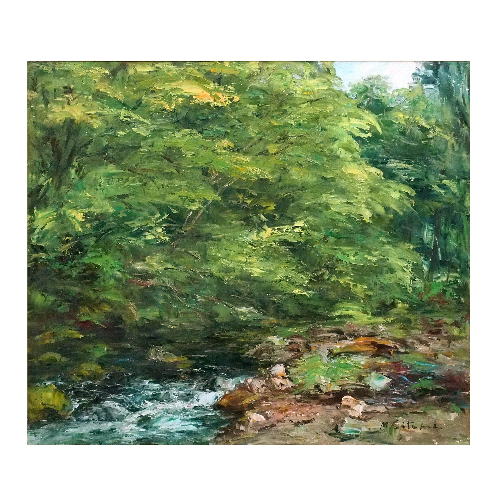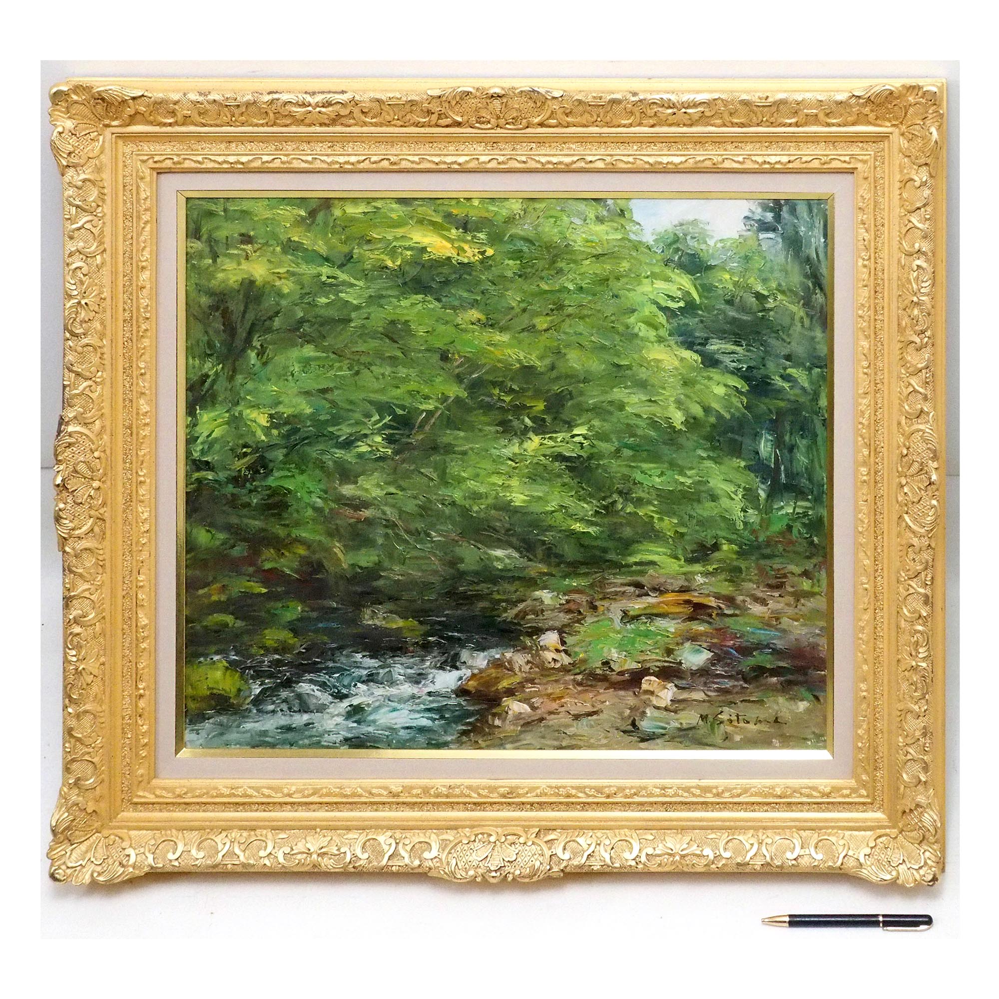 「塩原渓流」五月女政平によるキャンバスに油彩10号で、額裏にtacシールがございます。