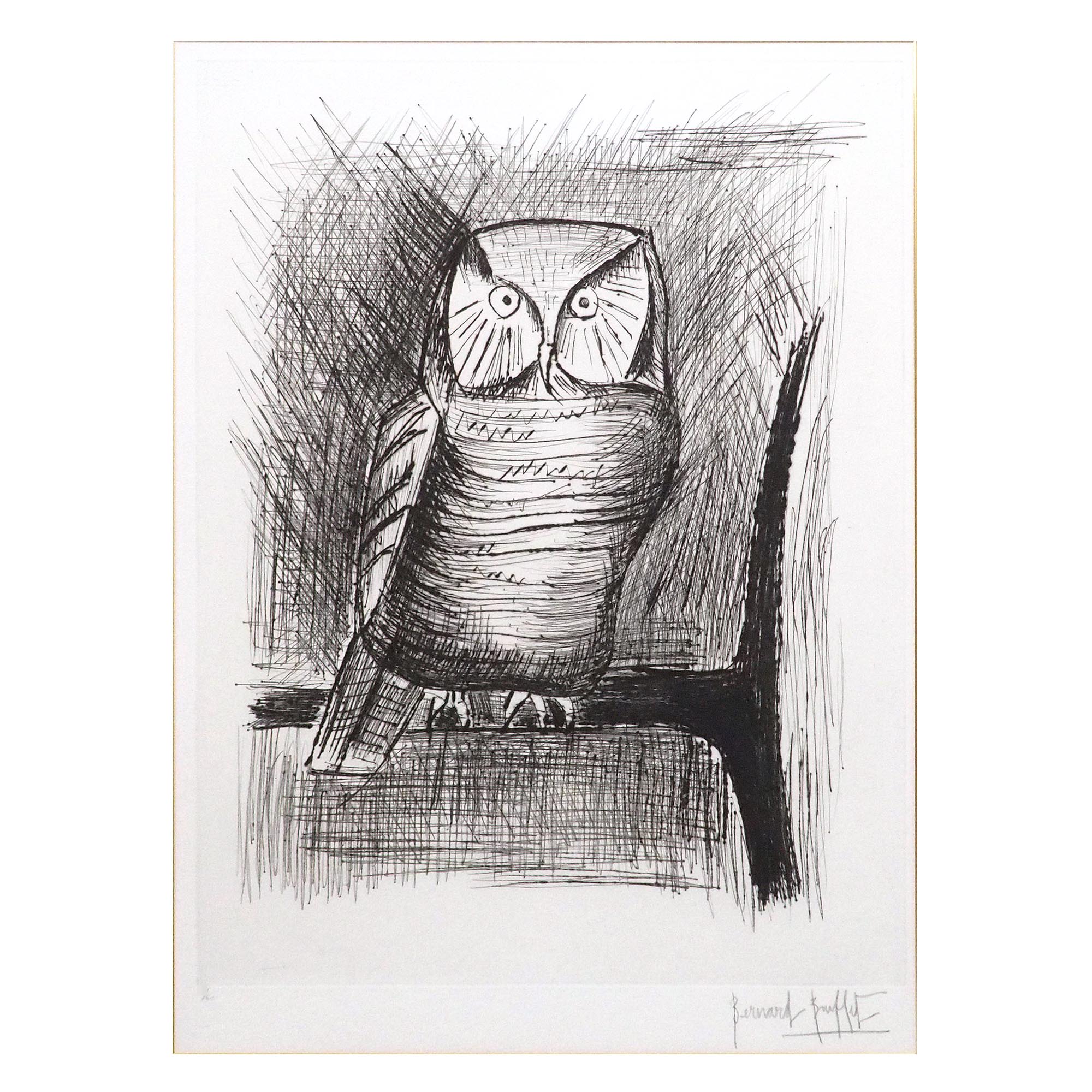 「ふくろう」ベルナール・ビュッフェによる1988年作、直筆サイン入りのドライポイントです。