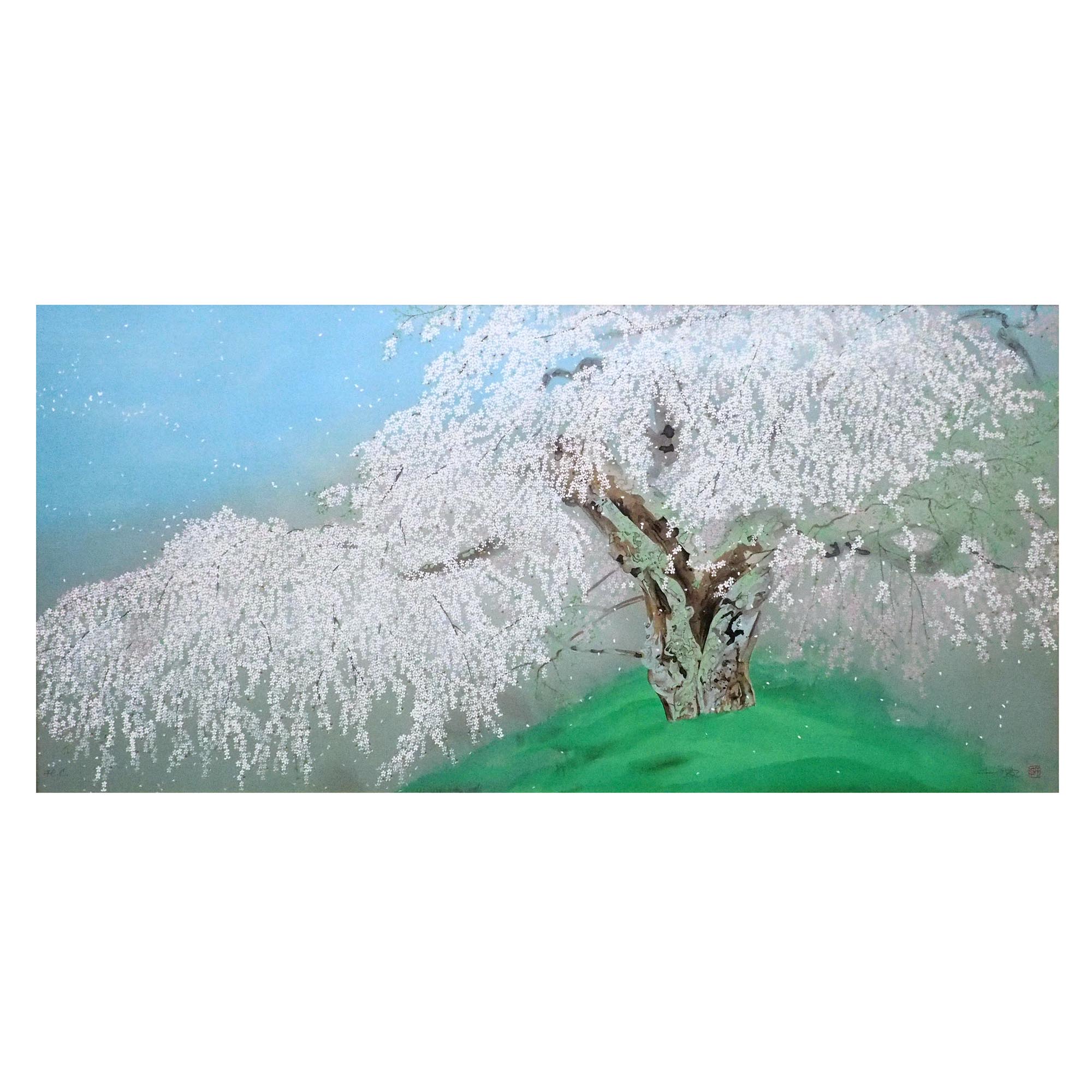 「晴日 本久寺の枝垂桜」中島千波による2001年作、直筆サイン・印有りのシルクスクリーンです。大きいサイズですが、横長のため空間に収まりがよい作品です。