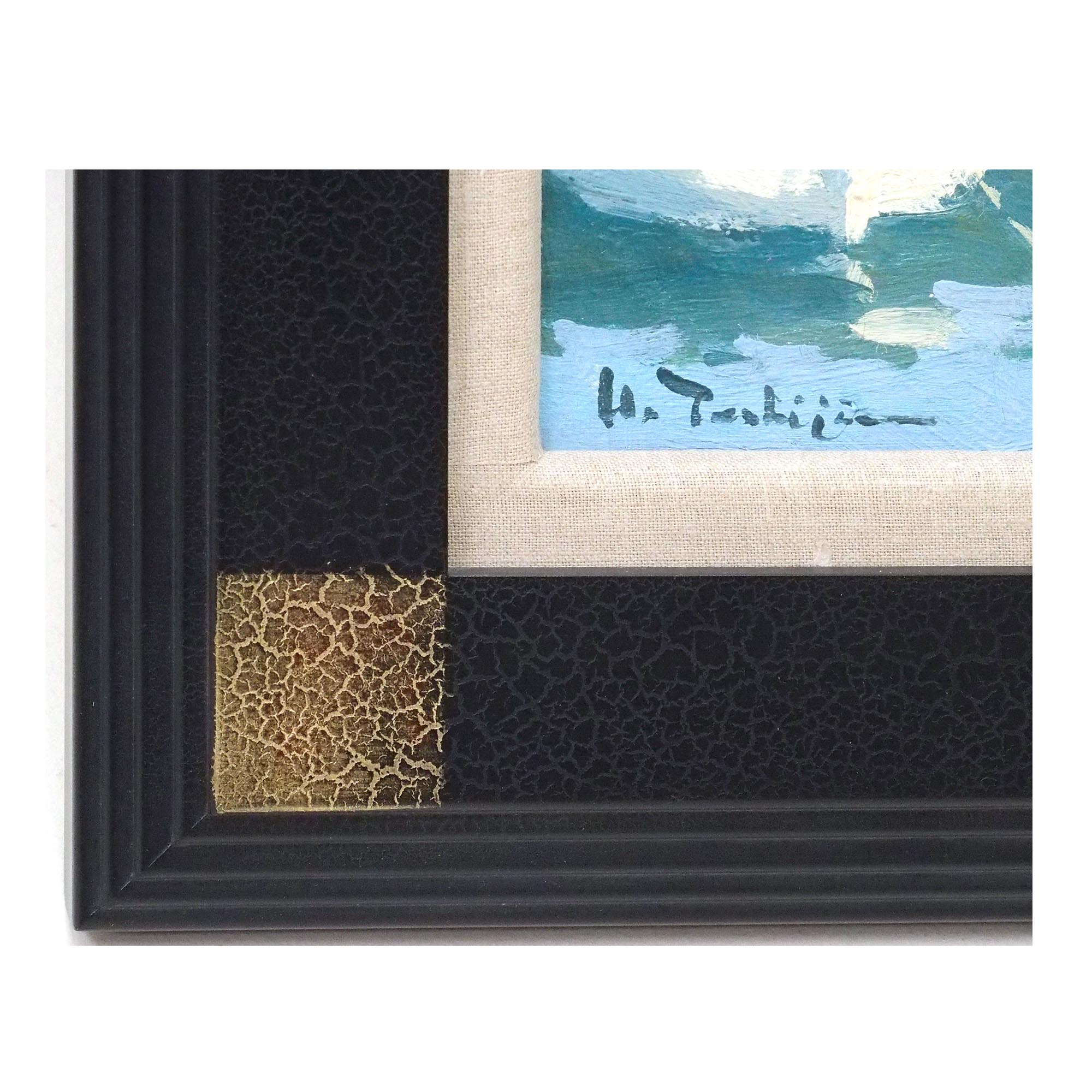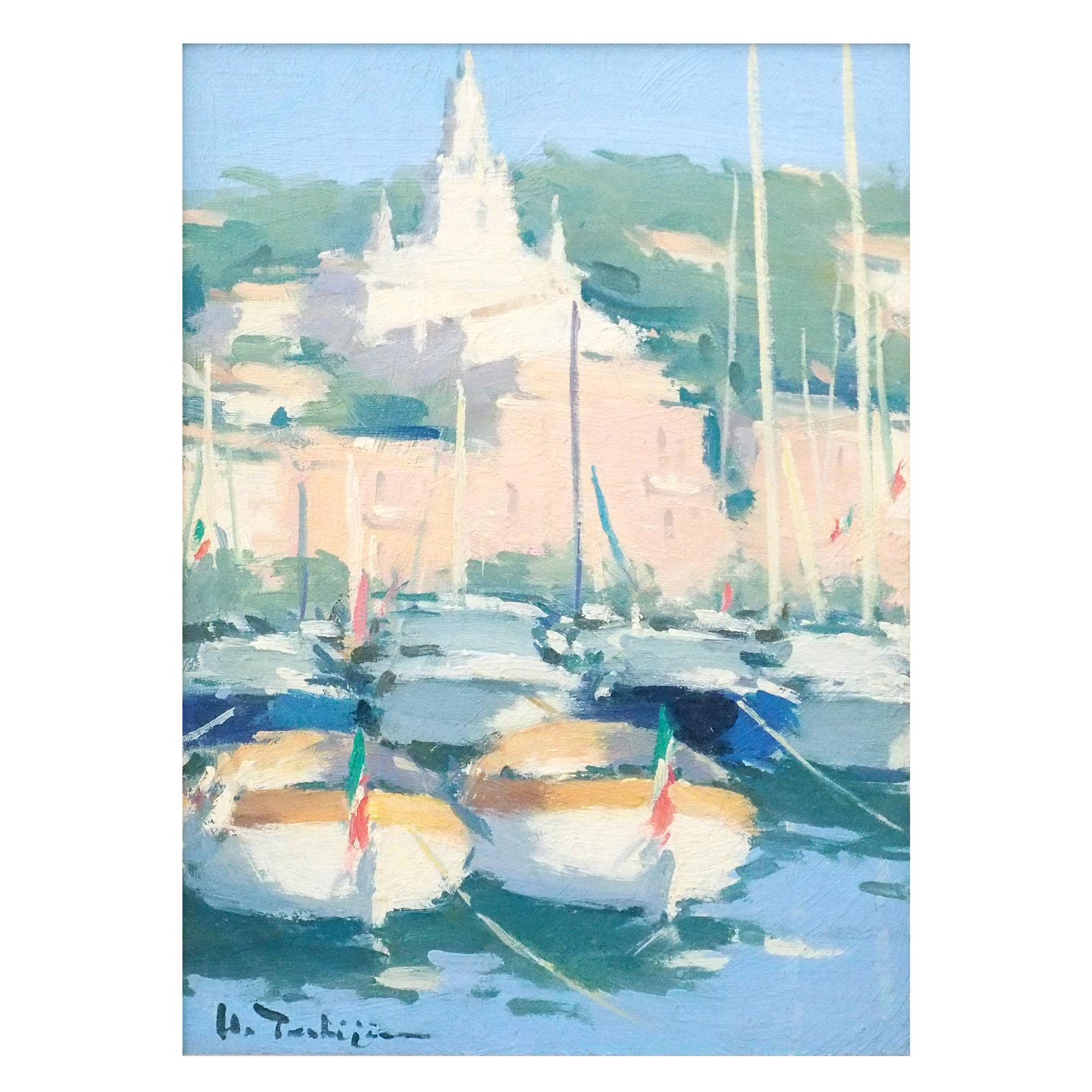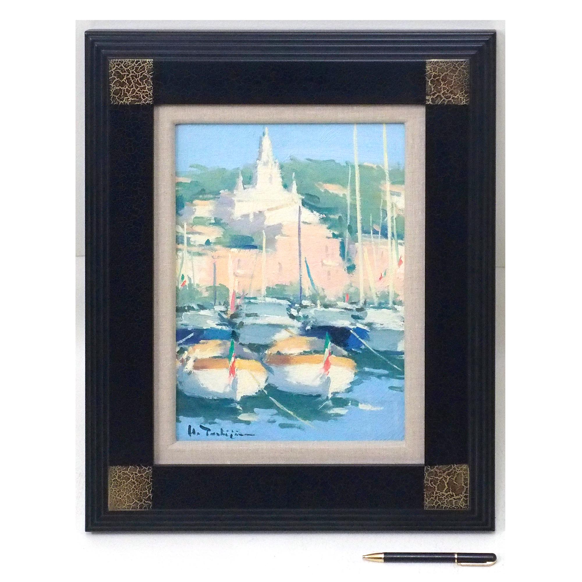 「リビエラの港(サンタ・マルゲリータ)」歳嶋洋一朗によるキャンバスに油彩4号、飾りやすいサイズの作品です。
